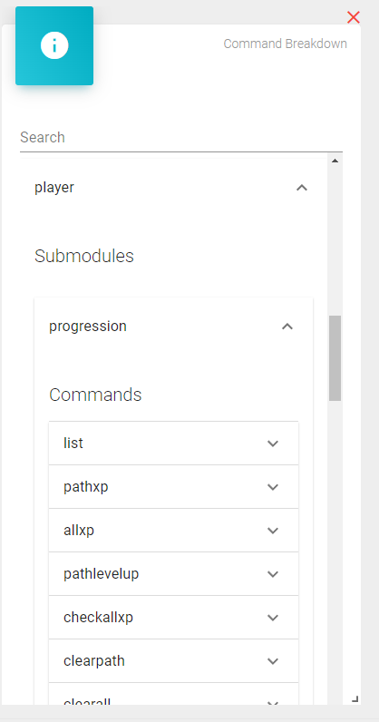 But the least of us know every command and newbies to this game may feel lost at the start. This is right time to explore the next module! Command breakdown can help you find the right command. Here you will find all commands listed and a short explanation what they do. Just click through this nested list and explore the cool and helpfull stuff offered by the dashboard. A complete command from this screenshot could be "player progression pathlevelup". You just need to use "module" "submodule" and "command" in one row.
