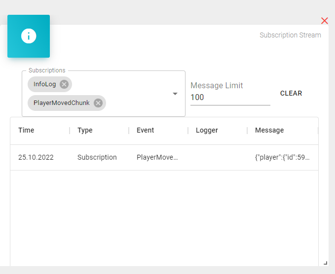 Also very useful is the subscription stream. Here you can select one or more triggers you like to watch. For example "PlayerMovedChunk" provides you with live data whenever a user is moving from one chunk of the map. to another. Or "PlayerKilled" gives you intersting informations about this event. These streams help you investigate what's happening on your server.